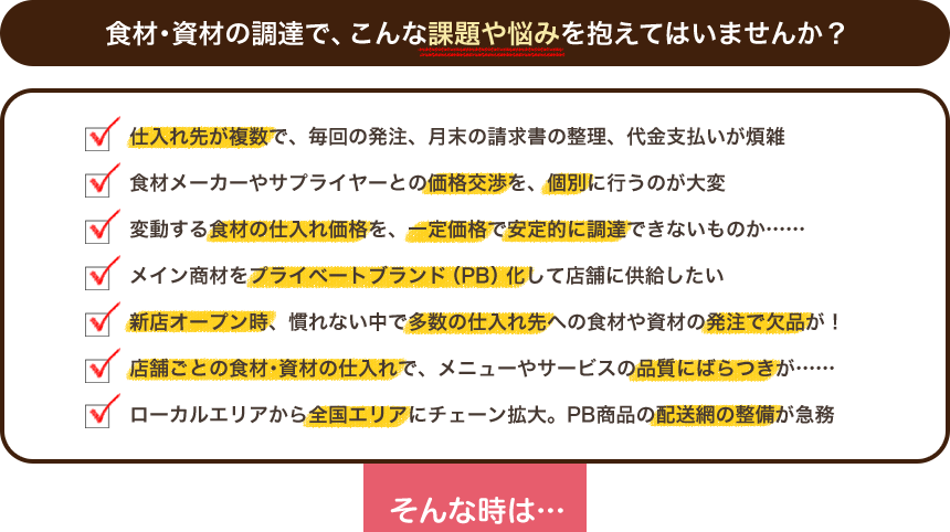 皆様が潜在的に抱えている食材や資材の調達に関わるさまざまな課題とそのリスクを明確にし、発注業務や仕入れ業務のスリム化・効率化による、原材料費の安定化、コストダウンを実現するためのプランをご提案します。